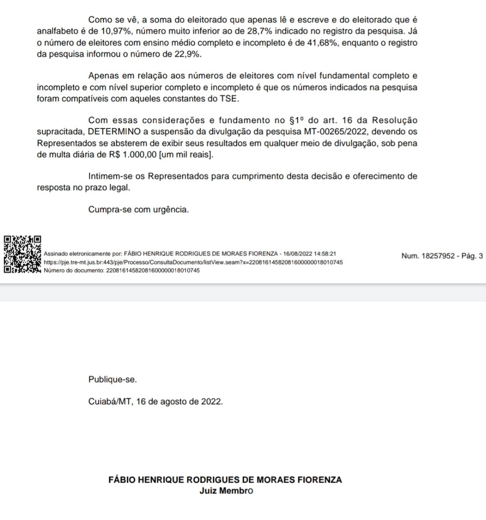 O juíz cita na decisão, que a soma do eleitorado que apenas lê e escreve, e do eleitorado que é analfabeto é de 10,97%. Número muito inferior ao de 28,7% indicado no registro da pesquisa.