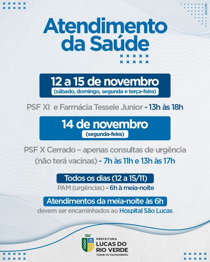 A Prefeitura de Lucas do Rio Verde informa que na próxima segunda e terça-feira não haverá atendimento no Paço Municipal e outras unidades públicas. Dia 15 de novembro é feriado nacional de Proclamação da República e dia 14 é ponto facultativo.