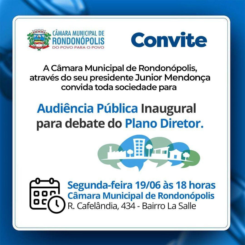 “A Audiência Pública da próxima segunda-feira trata-se de um evento aberto à toda a sociedade. É importante que cada cidadão de Rondonópolis, que tenha uma ideia a complementar o Plano Diretor, visando o desenvolvimento da cidade para as próximas três décadas, participe conosco deste debate”, frisou Júnior Mendonça.
