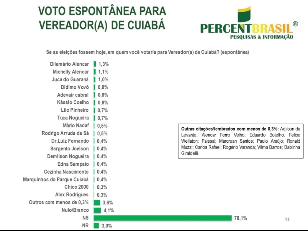 O vereador, Lilo Pinheiro (PDT), e o servidor público, Tuca Nogueira (PSB), estão empatados com 0,7%. Vale destacar que Tuca aparece com melhor desempenho entre os novatos, que não fazem parte da atual legislatura da Câmara Municipal de Cuiabá.
