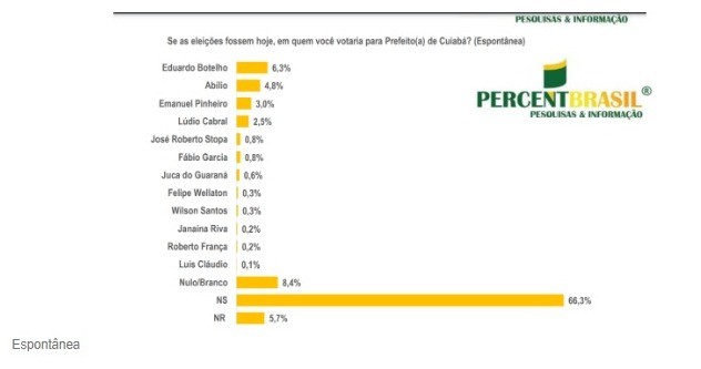 Na modalidade espontânea, Botelho assumiu a liderança com 6,3% das intenções de votos, seguido por Abílio com 4,8%. O atual prefeito da Capital, Emanuel Pinheiro (MDB), é o terceiro colocado com exatos 3%, mas ele não pode concorrer novamente, em 2024, uma vez que já ocupa o seu segundo mandato consecutivo.