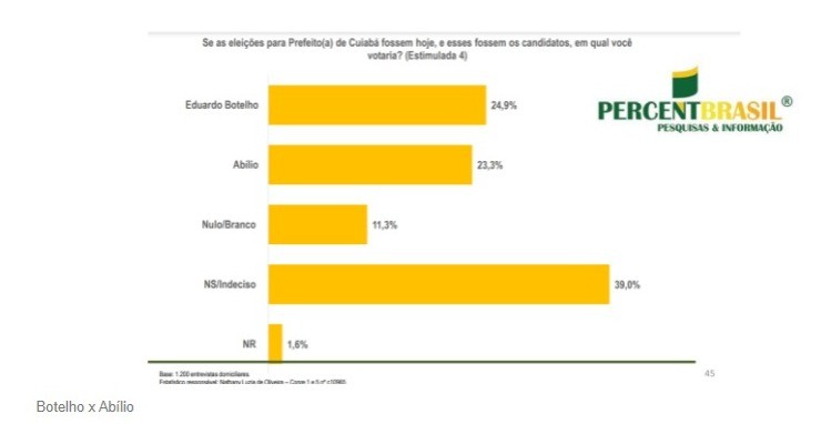 Uma pesquisa realizada pelo Instituto Percent, apontou que o presidente da Assembleia Legislativa, Eduardo Botelho (União Brasil), pela primeira vez, apareceu numericamente à frente do deputado federal, Abílio Júnior (PL).