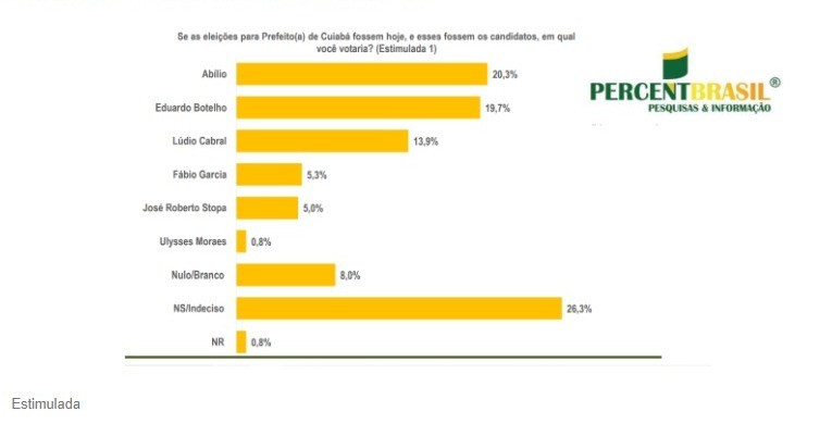 Quando se estimula o entrevistado com a apresentação de vários nomes, Abílio é o primeiro colocado com 20,3%, seguido muito de perto por Botelho que obteve 19,7% das citações. A diferença entre os dois principais postulantes ao cargo de prefeito de Cuiabá é de menos de 1%, fato que caracteriza rigoroso empate técnico.