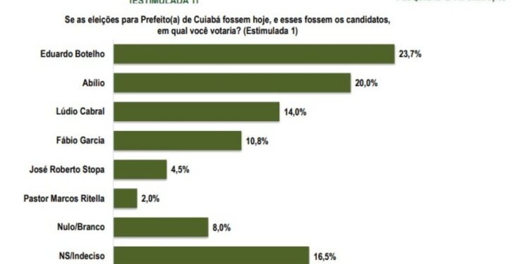 Botelho que atualmente está no mesmo partido que o governador, mas não conta com apoio do mandatário do Estado, aparece com 23,7% da intenção de votos, enquanto o deputado federal Abílio Brunini figura com 20%. Já Lúdio Cabral que até o momento é o nome do PT como pré-candidato aparece em terceiro com 14%; Fábio Garcia (União) que é o queridinho do governador Mauro Mendes teve um crescimento em relação a última pesquisa e aprece com com 10,8% da intenção de votos. O vice-prefeito José Roberto Stopa (PV), que é a aposta de Emanuel Pinheiro aparece apenas na quinta posição com 4,5% e Marcos Ritella é o último com 2%.