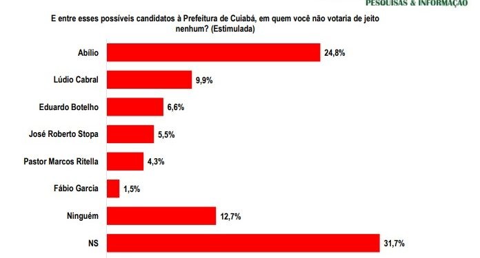 A pesquisa também avaliou a rejeição dos pré-candidatos. A pergunta-chave foi direta: “Entre esses possíveis candidatos à Prefeitura de Cuiabá, em quem você não votaria de jeito nenhum?”