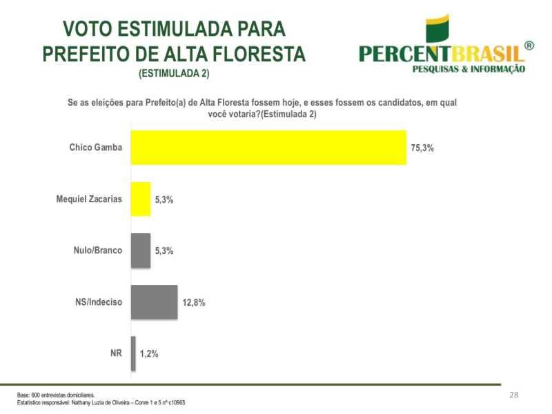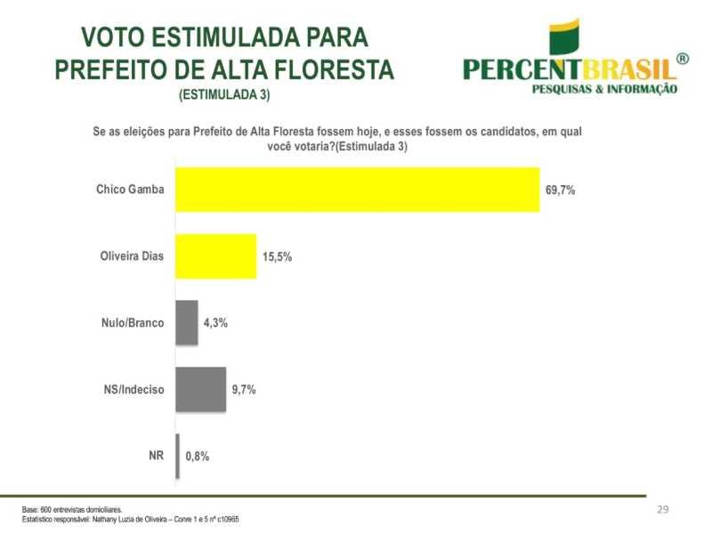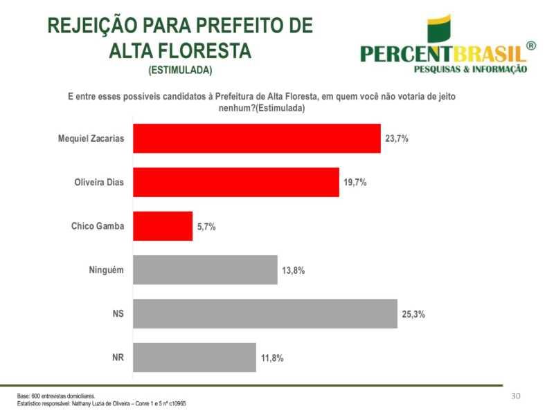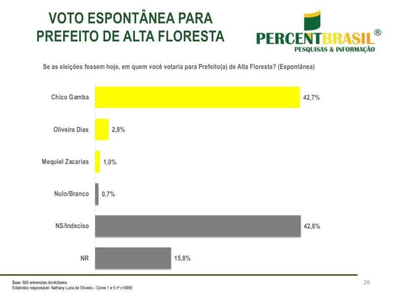 A Estatístico responsável pela pesquisa da PercentBrasil: Nathany Luzia de Oliveira – Conre 1 e 5 nº c10965 3. O estudo abrangeu todas as regiões de Alta Floresta, tanto urbanas quanto rurais, e foi registrado no Tribunal Superior Eleitoral sob o número MT-06709/2024, garantindo sua validade e confiabilidade.