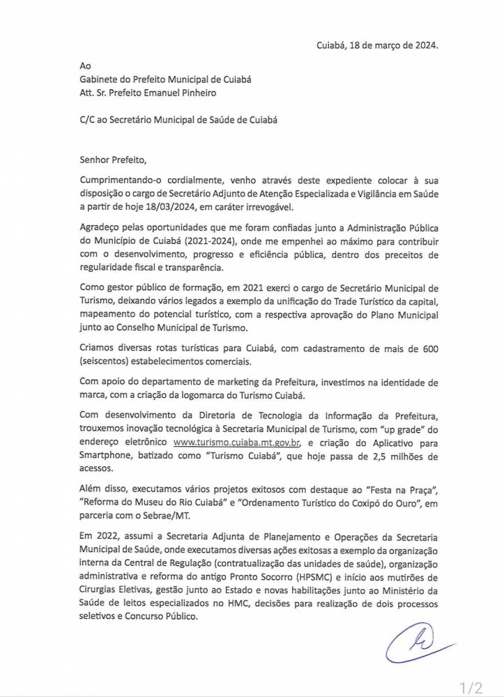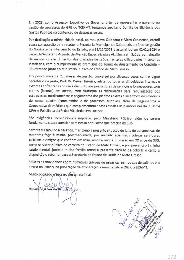 Na tarde desta segunda-feira (18), o servidor público de carreira do Estado e atual Secretário Adjunto de Atenção Especializada e Vigilância em Saúde de Cuiabá, Oscarlino Alves, protocolou um pedido de exoneração do cargo, em caráter irrevogável.