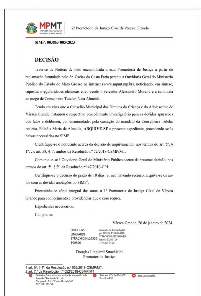 "Tendo em vista que o Conselho Municipal dos Direitos da Criança e do Adolescente de Várzea Grande, instaurou o respectivo procedimento investigatório para as devidas apurações dos fatos e deliberou, por unanimidade, pela cassação do mandato da Conselheira Tutelar reeleita, Edinéia Maria de Almeida, ARQUIVE-SE o presente expediente, procedendo-se às baixas necessárias no SIMP", diz trecho da decisão proferida no dia 26 de janeiro de 2024,