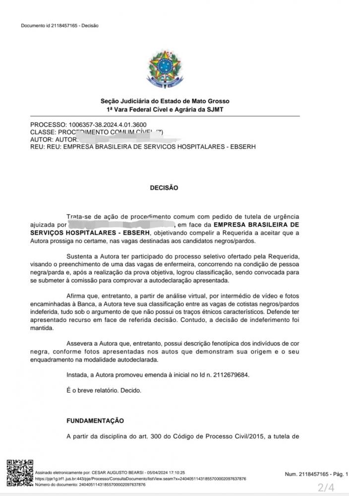 A 1ª Vara Federal de Cuiabá determinou que candidata Y.C.M.G prossiga no certame do concurso da Empresa Brasileira de Serviços Hospitalares (Ebserh), para o cargo de enfermeira, reconhecendo a condição de cotista a uma das vagas reservadas aos candidatos negros e pardos.