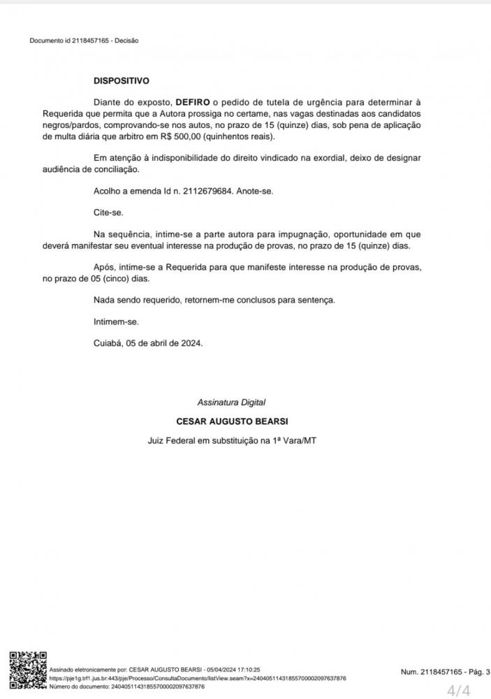 A liminar proferida no dia 05 de abril, pelo juiz Cesar Augusto Bearsi, entendeu que "a luz dos elementos extraídos dos autos e em consonância com o entendimento jurisprudencial sedimentado pelo Tribunal Regional Federal da 1ª Região, é possível vislumbrar que, diante das características físicas da Autora, que mais se aproxima da cor parda, se mostra coerente reconhecer a veracidade da autodeclaração de cor apresentada pela candidata, que se enquadra na condição de cor parda".