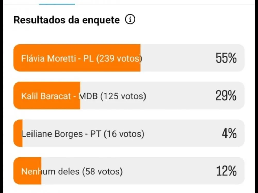 Kalil Baracat (MDB) alcançou 29%, a pré-candidata Leiliane Borges (PT), chegou aos 4%, e 12% escolheram "Nenhum deles" como opção.