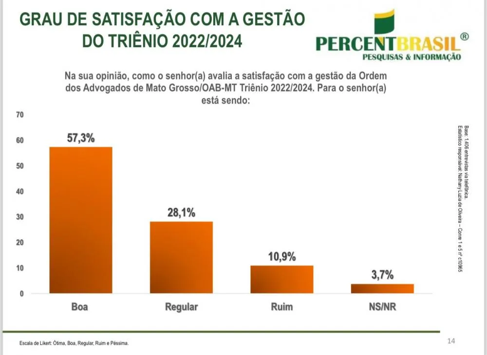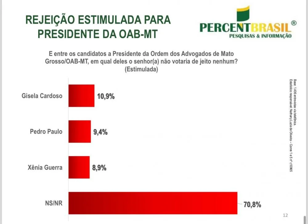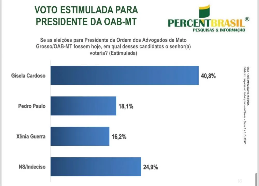 O Instituto Percent Brasil entrevistou 1.406 advogados em Mato Grosso, via telefone, com uma duração de 05 minutos aproximadamente. O intervalo de confiança é de 95% e a margem de erro é de 2,44% para mais ou para menos. A pesquisa foi realizada entre os dias 07 e 13 de agosto de 2024.
