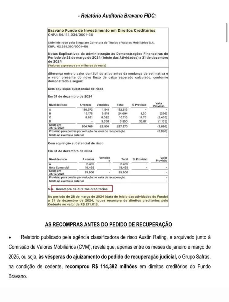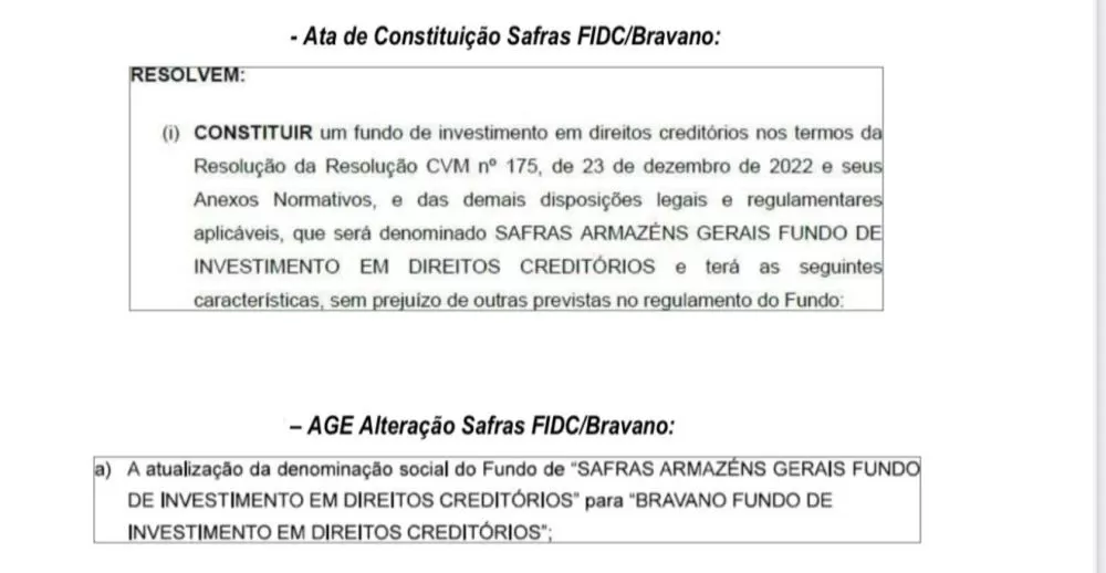 Aliás, o Grupo Bravano foi criado com o seguinte nome: Safras Fidc em dezembro de 2022, onde já começavam a organizar essa suposta operação. Esse fundo, atualizou sua denominação social para Bravano FIDC:
