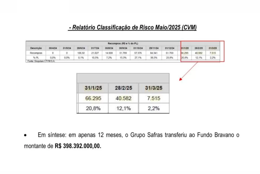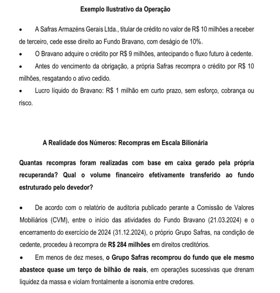 A Safras Armazéns Gerais Ltda., integrante do Grupo Safras, emite e cede títulos de crédito ao Fundo Bravano, com deságio, isto é, transfere recebíveis futuros por valor inferior ao nominal;