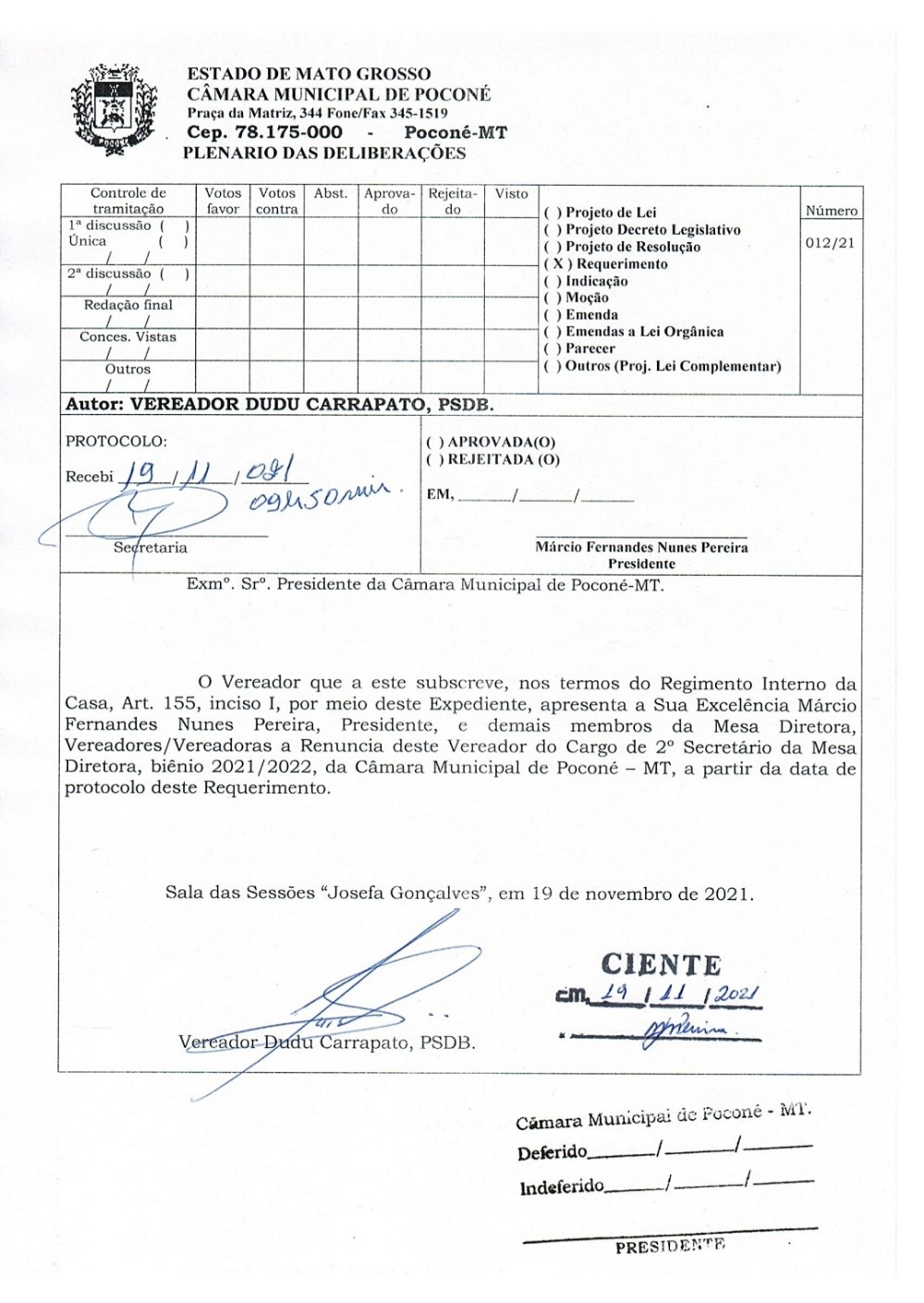 O Vereador por Poconé, Luis Eduardo Almeida (PSDB), popularmente conhecido como Dudu Carrapato, protocolou na manhã desta sexta-feira(19/11), um requerimento renunciando o seu cargo na Mesa Diretora, da Câmara Municipal de Vereadores.